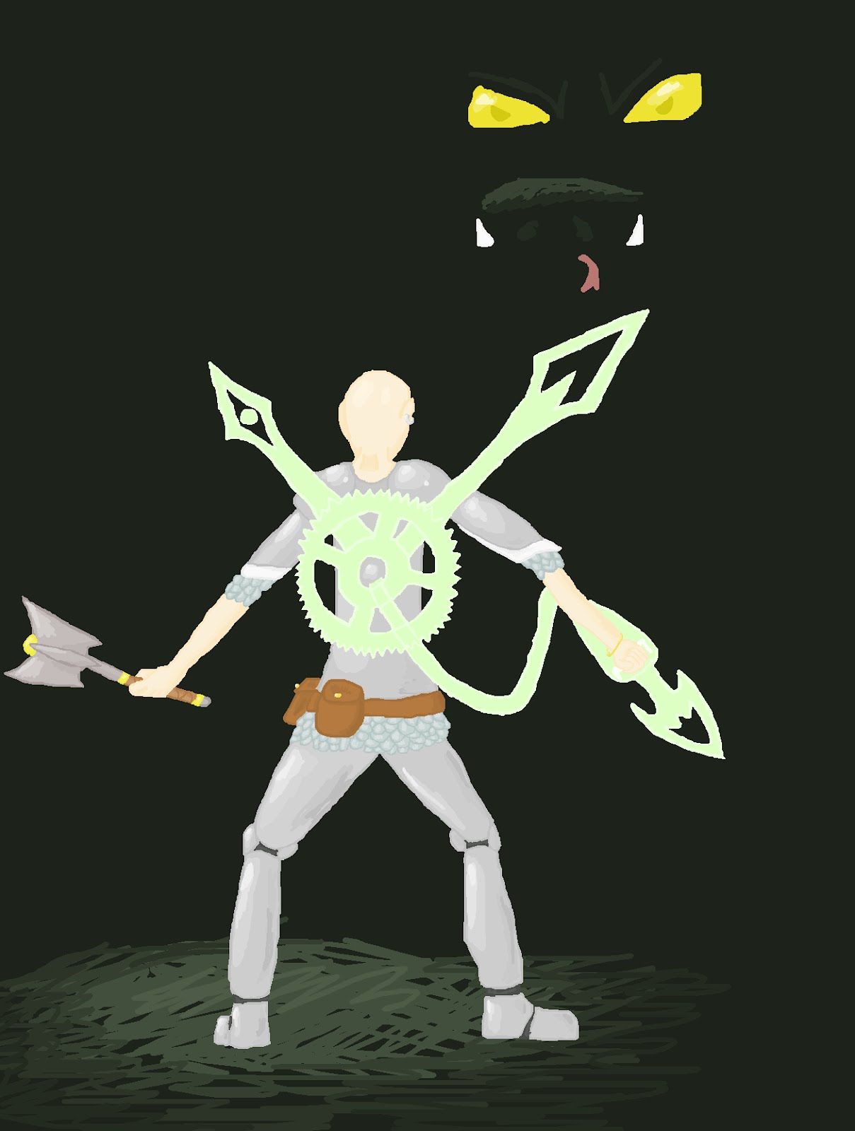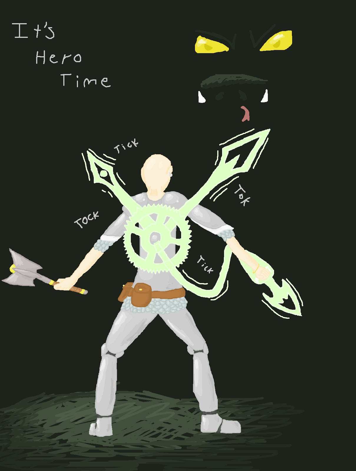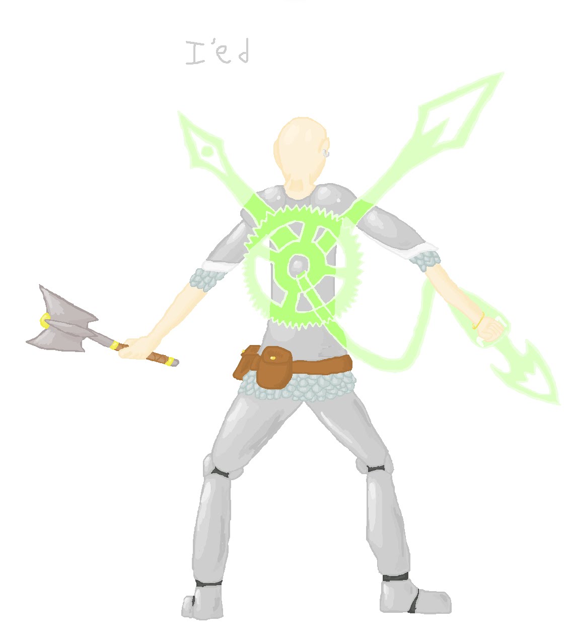 So I'ed is a character from a D&D campaign I'm playing in. I'ed is a cleric and through various stupid and awesome decisions his God dropped him. Then another God came to him and gave him more time to save the world. So I'ed got a pocket watch that ticks down to his death and that allows him to use special powers at the cost of some time.His magic is also clocked based as seen in the picture. The two hands rotate and tick. He can shoot out clock hands (Green is damage while he can shoot out a blue for healing). He'll gain various other powers as well. (And he's my highest level D&D character ever at level 4 :D)
